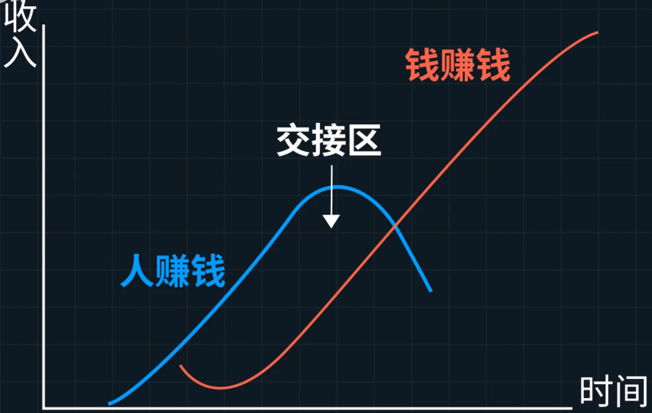 - 直到有一天,人赚钱的能力下降,但本金却越来越多,此时钱赚钱才能接棒成为新主力。