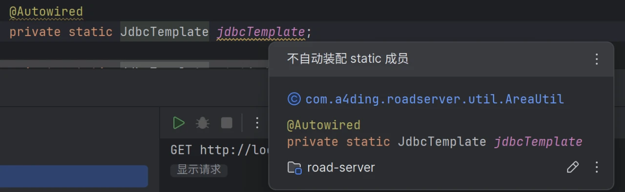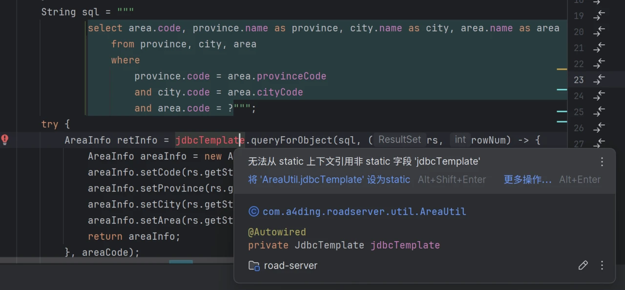 但此时,IDE 会提示“无法从 static 上下文引用非 static 字段 'jdbcTemplate'”,同时给修复建议:将 jdbcTemplate 设为 static。另外一个选项是将 getArea 设为非静态,但显然不符合你的预期。