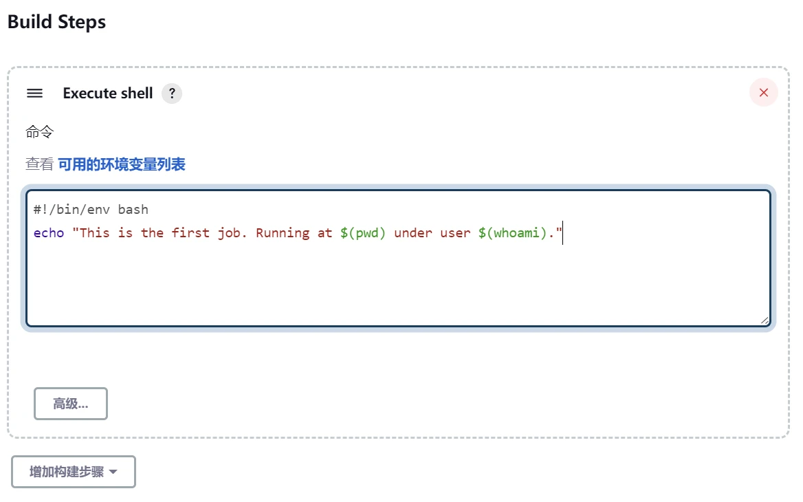 直接配置构建步骤,让该任务执行 Shell 脚本