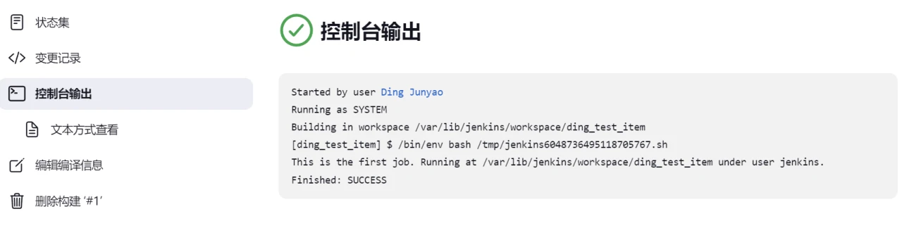 此前的脚本输出了 Jenkins 这次构建所在的工作目录,以及使用的用户。