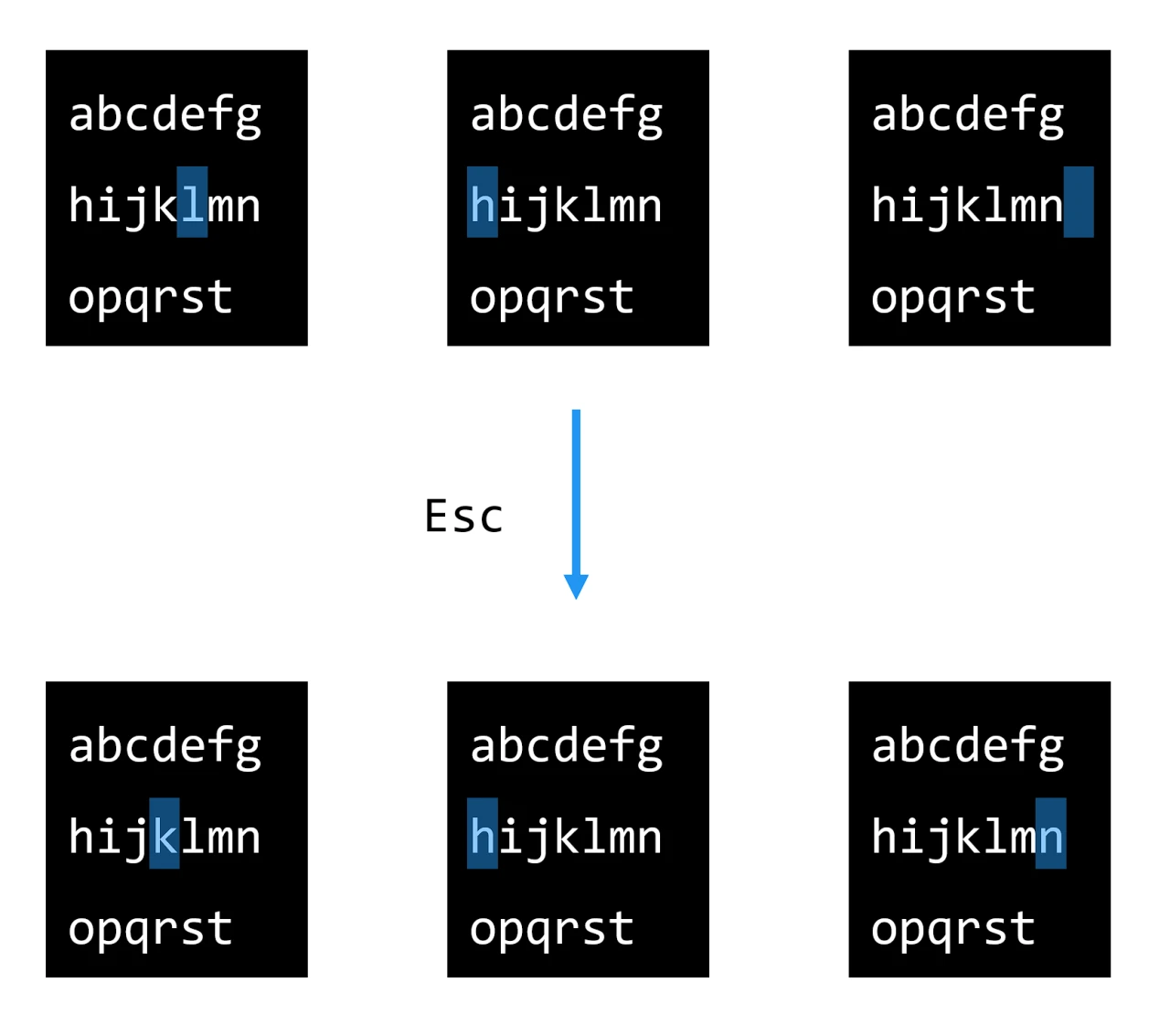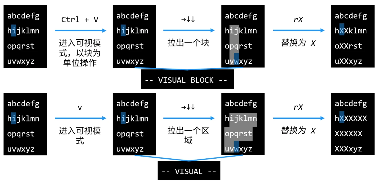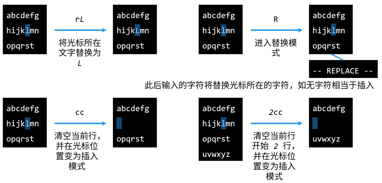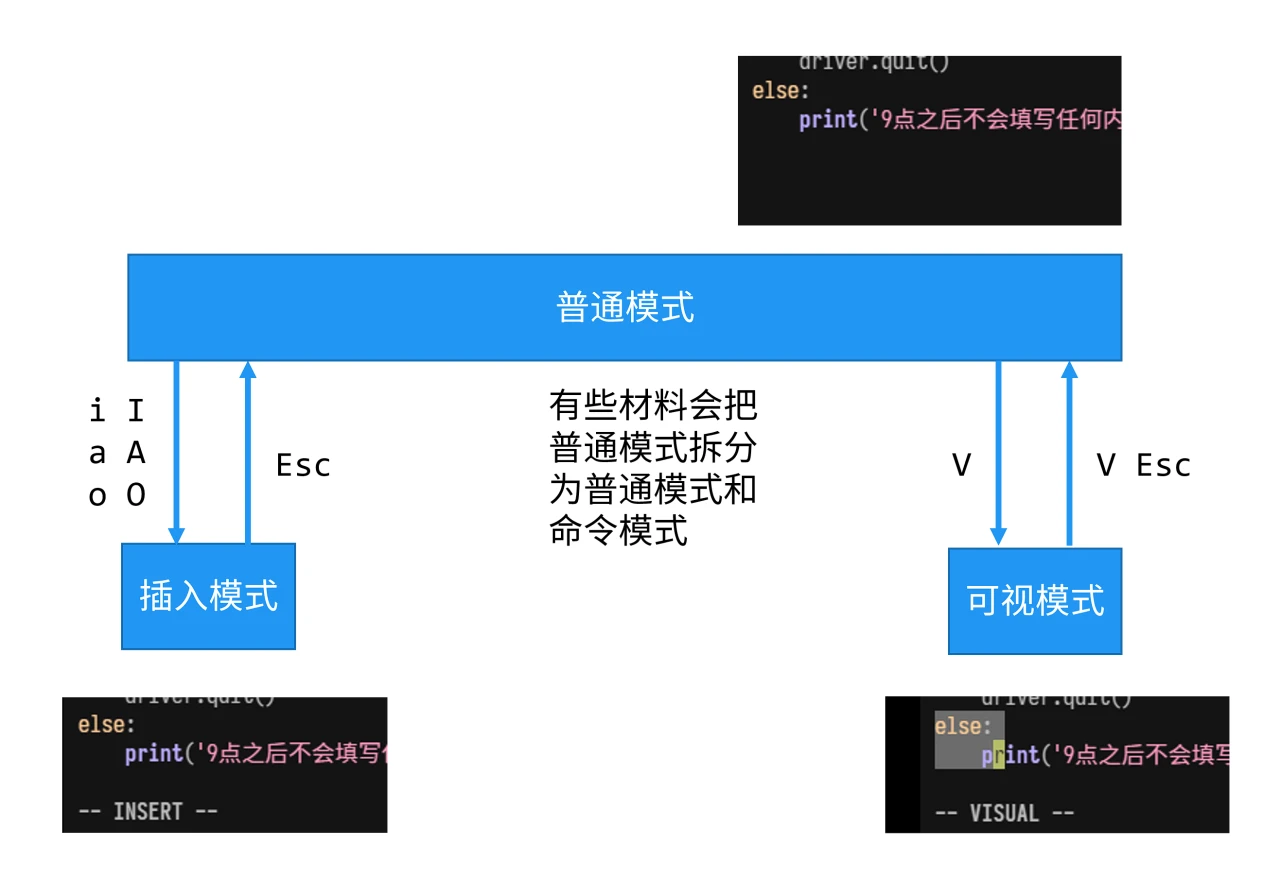 普通模式下,h j k l 与 ← ↓ ↑ → 功能一样。