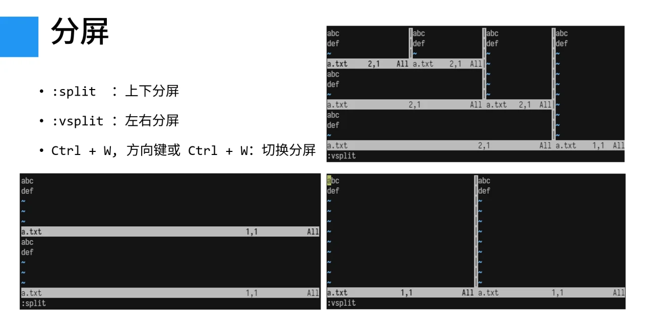 :split:上下分屏:vsplit:左右分屏- Ctrl + W, 方向键或 Ctrl + W:切换分屏