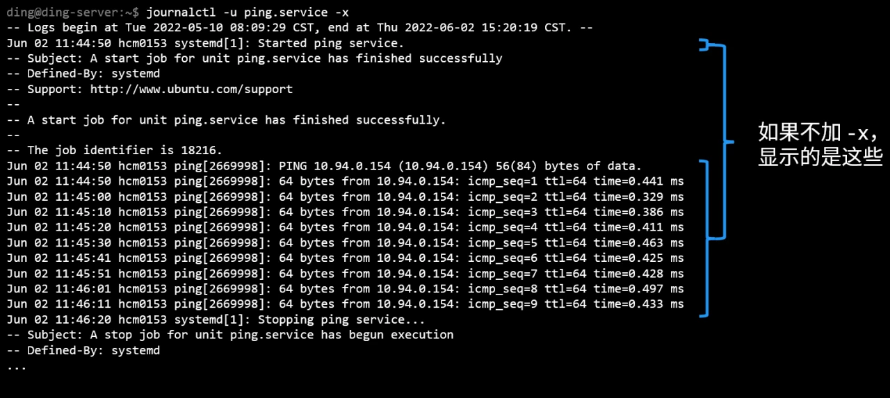 | ding@ding-server:~$ sudo systemctl start ping.service