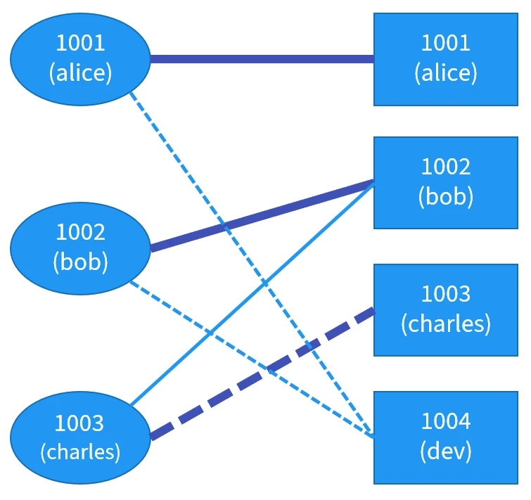系统中只记录 UID 和 GID,一般不会记录其名称。