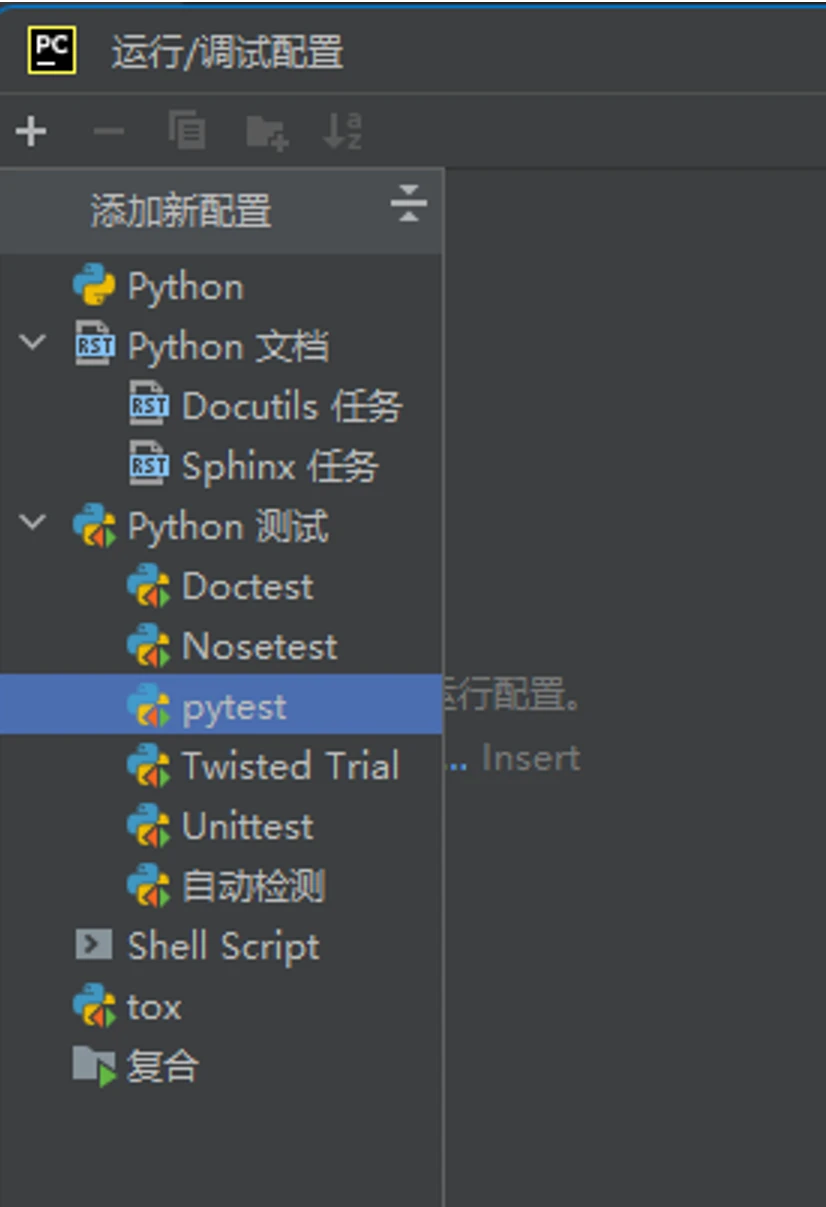 在弹出的“运行/调试配置”中,点左边的加号,添加“Python 测试 → pytest”选项