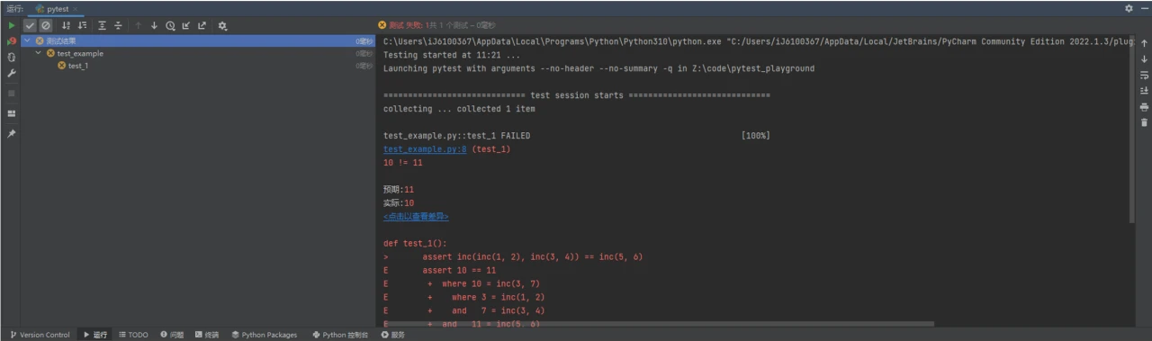 FAILED test_example.py::test_1 - assert 10 == 11