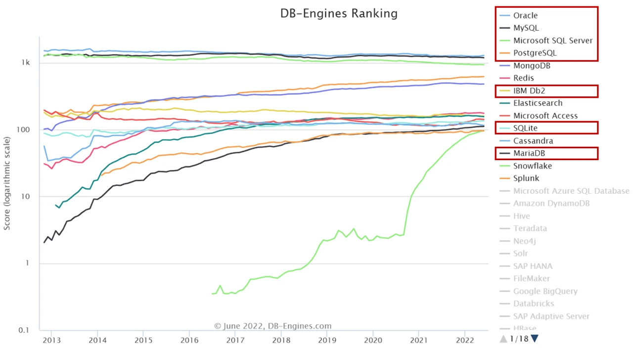 - historical trend of the popularity ranking of database management systems