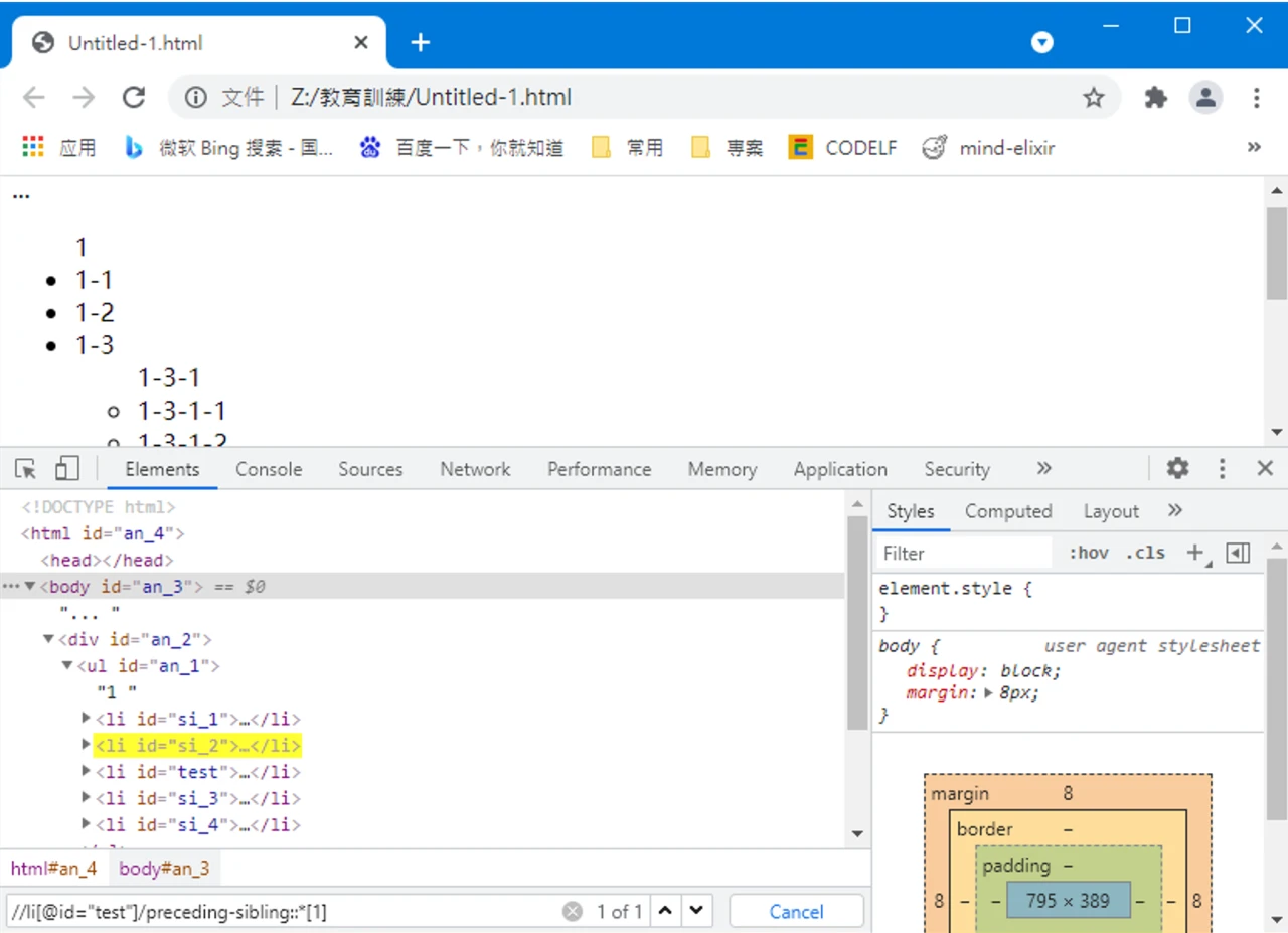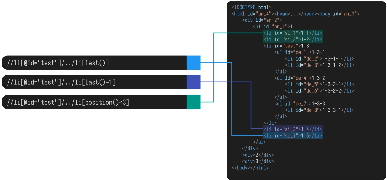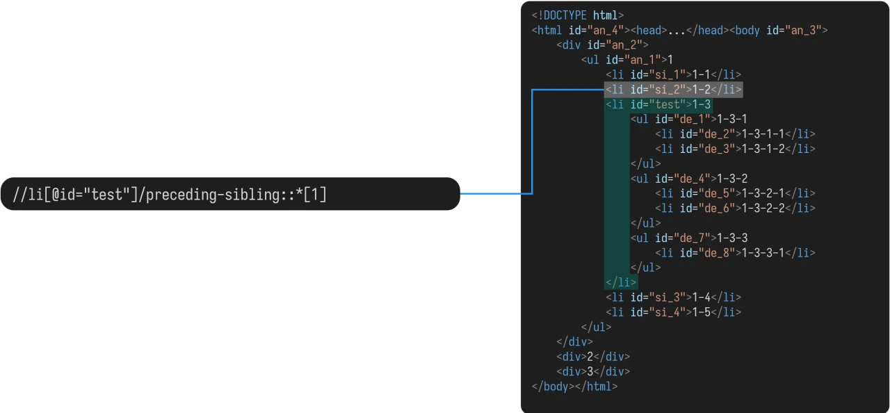 preceding-sibling 中,若结果有多个,在指定下标的时候,从离锚元素最近的元素开始,从 1 算起。如: